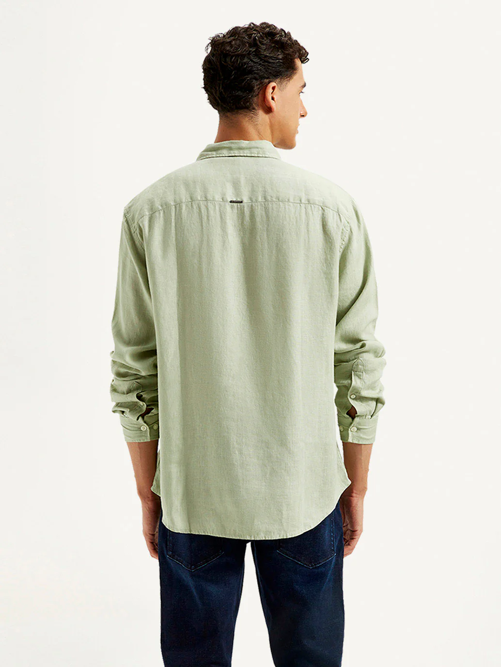 Levi's green button-down shirt in a solid print is a must-have item for the modern man's closet. Tailored in premium linen this classic spread collar and full sleeves make it perfect for an uber casual look.