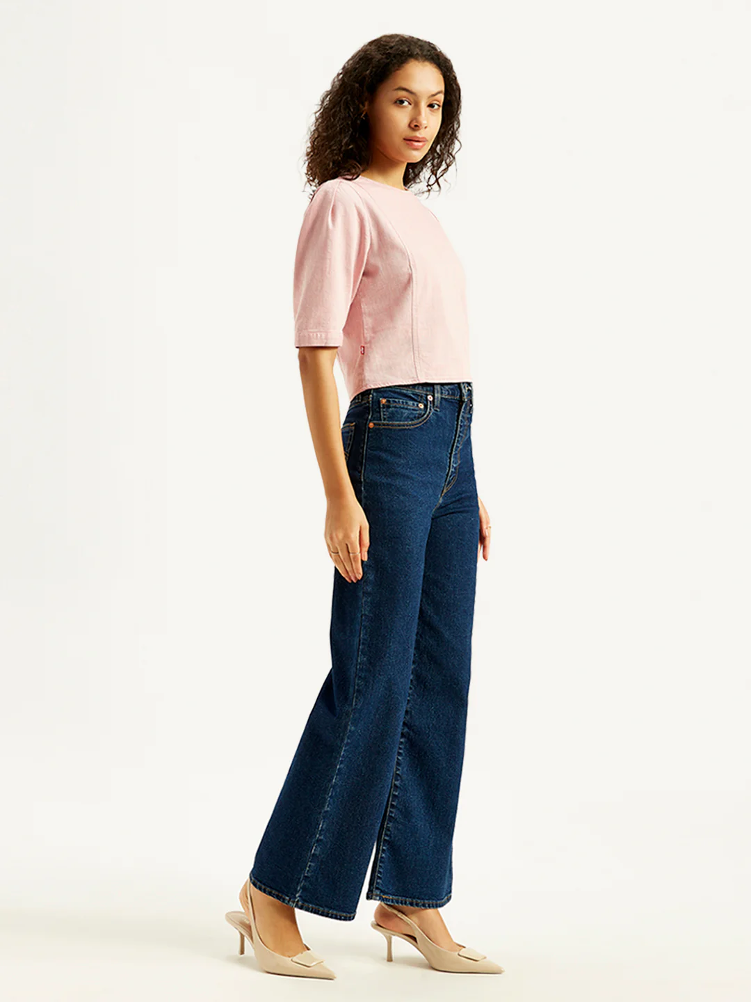 1. Classic wide leg fit; Sits at high rise