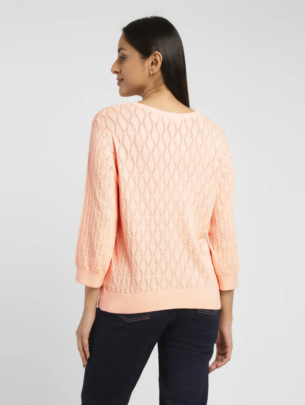 Women's Self Design Peach Crew Neck Sweater