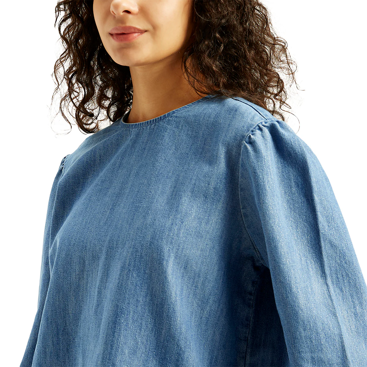 Women's Solid Blue Round Neck Denim Top